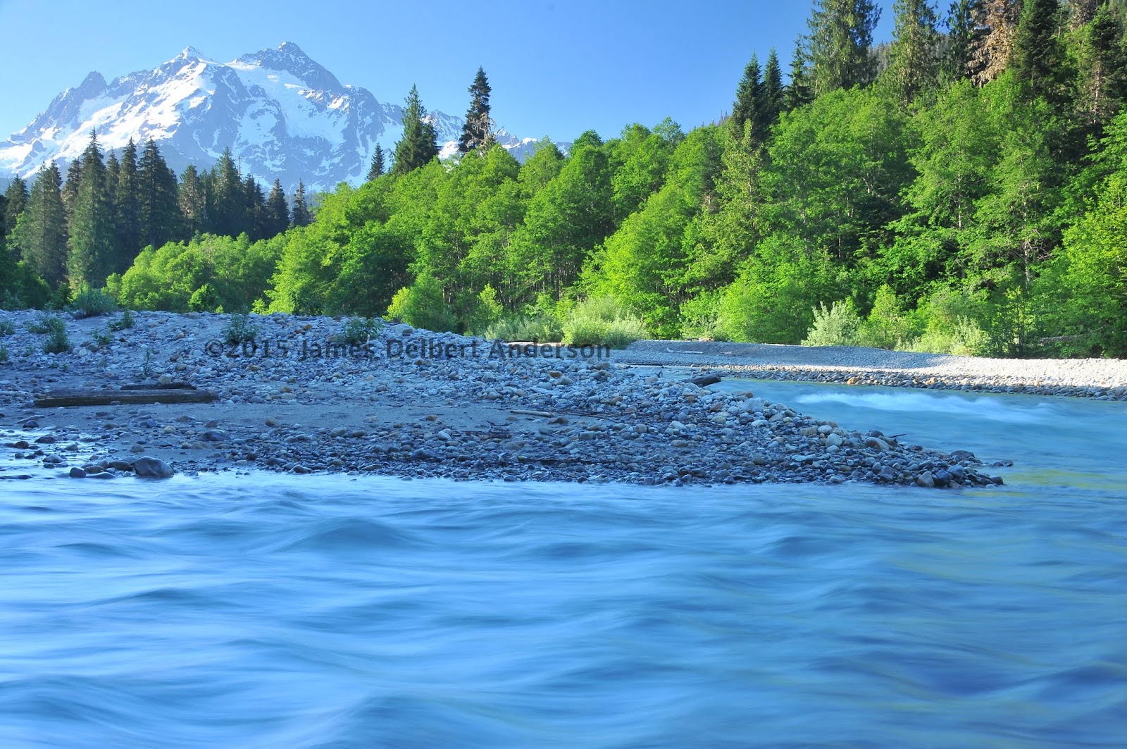 On the way there, I stopped at a spot on the access road that features a view of Mt. Shuksan over what I think is a channel of the North Fork Nooksack River. I've been here before, and I think I identified the waterway incorrectly as Ruth Creek. The first image looks at Shuksan itself.