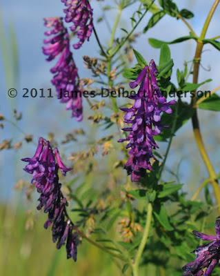 Additionally, I took some pictures of the daisies and vetch that are blooming. Flowers like daisies are hard to photograph because they are somewhat complex in structure. To illustrate by way of contrast, vetch flowers are fairly two-dimensional; it's easy to pick a point to focus on. But daisies are more three-dimensional. I don't know the names of the parts of the flowers; but which part of the yellow middle of the flower, and which petals, should be in focus? It's hard to judge, especially while in the field, which part will look better in focus. and after that, it's hard to get it right. In this case, I think I generally tried to get the middle of the yellow part in focus.